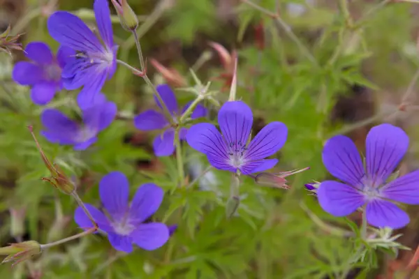 À medida que as pétalas não se sobrepõem, suas flores distintas parecem um anel de cinco grandes lágrimas de azul-violeta com veias roxas vívidas. A folhagem jovem e finamente dissecada e com tampas douradas amadurece para o rico verde quando começa a floração de junho a agosto. A sombra limitará seu vigor natural.