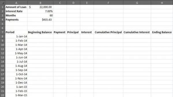 Por exemplo, suponha que este seja um empréstimo de cinco anos (60 meses), de $ 22.000, a uma taxa de juros de 7 por cento. Depois de definir os princípios básicos, você pode personalizar a tabela para refletir os termos de empréstimo que desejar.