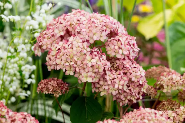 Hortênsia arborescens 'Invincibelle' tem flores rosa incomuns. Lastreador, grande e quase redondo, são perfeitos para crescer em uma borda herbácea mista ou cortando para o vaso - as flores podem até ser secas para usar em arranjos de inverno.